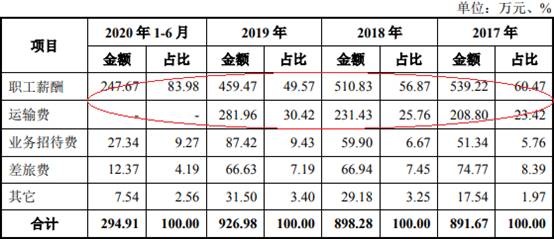 2017年至2020年1-6月,蓝箭电子销售费用中职工薪酬分别为539.22万元、510.83万元、459.47万元、247.67万元,占比分别为60.47%、56.87%、49.57%、83.98%;2017年至2019年,运输费分别为208.80万元、231.43万元、281.96万元,占比分别为23.42%、25.76%、30.42%。