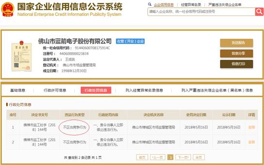 据国家企业信用信息公示系统显示,蓝箭电子上述虚假宣传违反违规行为属于不正当竞争违法行为。