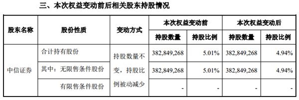 公司此次发行新增股份上市后,中信证券所持有的股份比例被动减少,导致其持股比例低于5%。为此,中信证券出具了《简式权益变动报告书》并与公告同步披露。此次权益变动前,中信证券持有中信建投股份3.83亿股,占权益变动前公司总股本的5.01%;此次权益变动后,中信证券持有公司股份数量不变,但持股比例被动减少至4.94%。