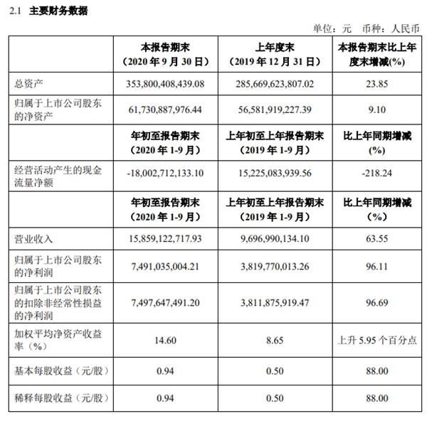 今年三季报显示,中信建投营业收入为158.59亿元,同比增长63.55%;归属于上市公司股东的净利润为74.91亿元,同比增长96.11%。