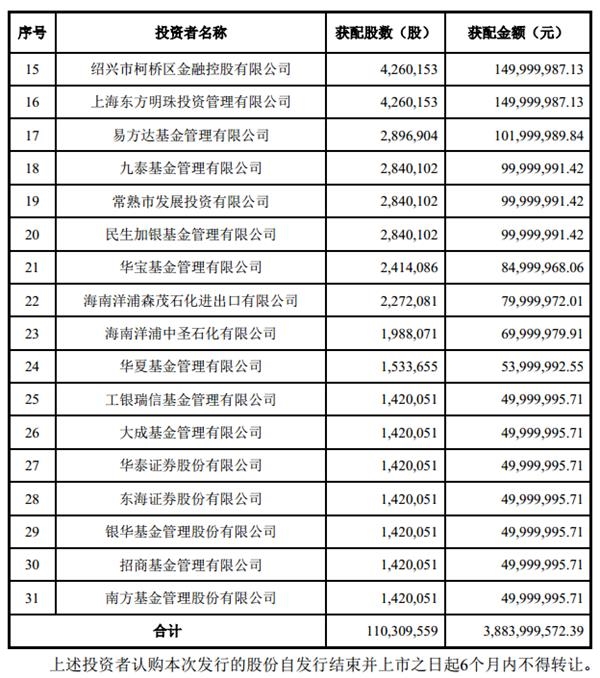 基金公司里面,华安基金、华商基金、易方达基金、华夏基金、工银瑞信基金、大成基金、南方基金等几家,获配较多的是华安基金获配426.02万股,获配金额1.50亿元;易方达基金获配289.69万股,获配金额为1.02亿元。