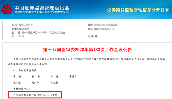 12月29日,证监会网站发布公告称,鉴于广州农村商业银行股份有限公司(以下简称“广州农商行”)已向证监会申请撤回申报材料,决定取消第十八届发审委2020年第183次发审委会议对该公司发行申报文件的审核。