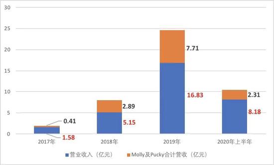 《投资时报》研究员查阅泡泡玛特上市前招股书发现,2017年—2019年及2020年上半年,该公司实现营业收入分别为1.58亿元、5.15亿元、16.83亿元和8.18亿元,归母净利润分别为156.90万元、9952.10万元、4.51亿元和1.41亿元。可以看到,其营收程稳步上升趋势,归母净利润则是三年时间就翻了超280倍。