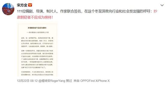 2020年12月21日,111位影视从业者联名发声:《抄袭剽窃者不应成为榜样!》,呼吁抵制此前已被法院判决剽窃他人作品的于正和郭敬明,此二人不应以节目导师身份出现在综艺节目中。联名信中包含了汪海林、谭飞、琼瑶等多位知名编剧,并且如今联名人数已经超过150位。