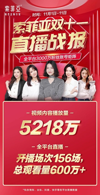 厚积薄发,一击即中,今年双十一,索菲亚集中发力,调动线下门店集中开播发声,累计直播场次156场,总观看量600万+,取得全网总销售业绩突破11亿的好成绩,再度蝉联天猫双11全屋定制类目销售额冠军,实现定制衣柜类目七连冠;同时,将京东“定制家具销售冠军”纳入囊中,达成连续三年蝉联品类冠军的成就。