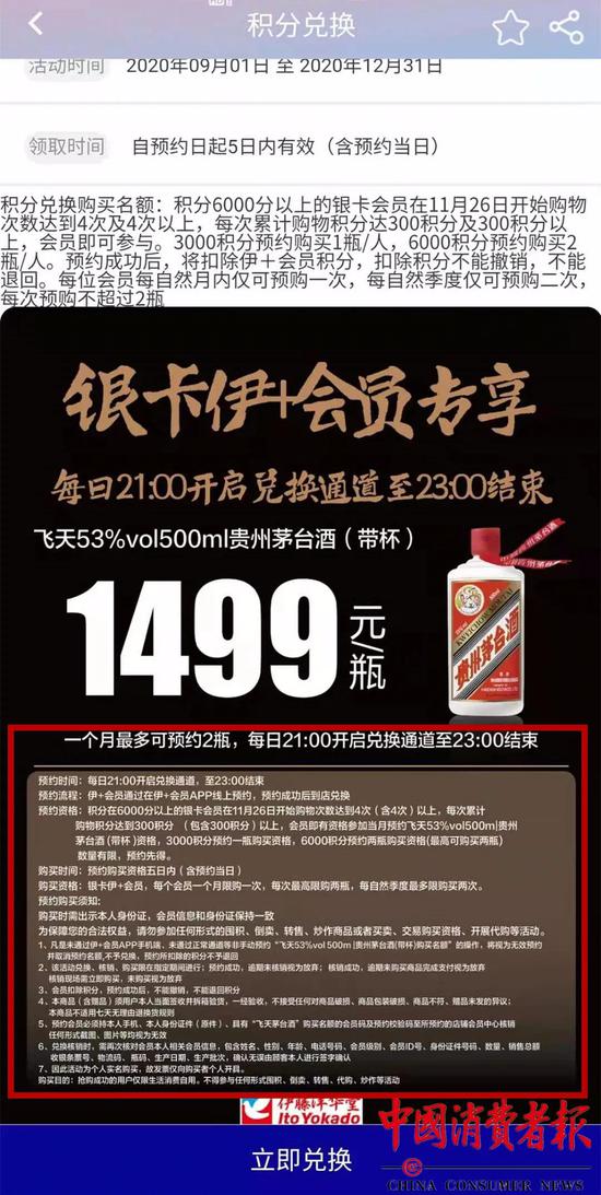 针对消费者反映的问题,12月29日,成都伊藤洋华堂有限公司回复记者称,活动性质是“积分兑换预约购买资格”,积分兑换了“预约购买资格”后,凭核销码到伊藤各店铺以1499元/瓶进行购买。为活动准备的茅台酒有数量限制,每天按计划具体数量兑换,并提前告知了消费者。