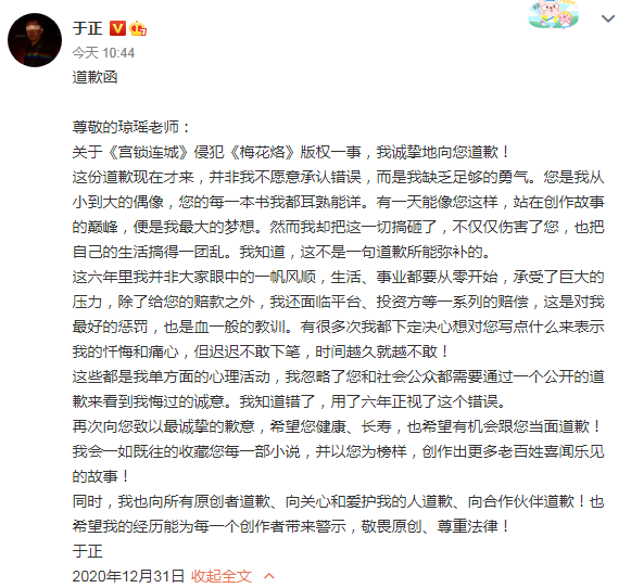 关于《宫锁连城》侵犯《梅花烙》版权一事,我诚挚地向您道歉!
