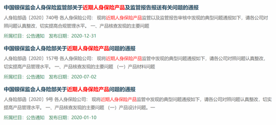 2020年,银保监会人身险部已经先后3次通报了人身险公司的保险产品问题,1月初,通报了19家险企,7月初,通报了20家险企。参见《刚刚,银保监会批评20家寿险公司:新华保险销售误导问题,引发非正常退保风险!》