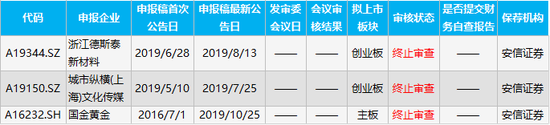 安信证券另外3家处于终止审查的公司分别为浙江德斯泰新材料、城市纵横(上海)文化传媒和国金黄金,拟上市板块为创业板和主板。