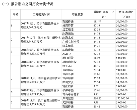 与此同时,仅在2017年8月至2019年11月的两年多时间内,柔宇科技就迅速进行了7次增资,共涉及21家股东,增资总对价50.53亿元,注册资本累计新增915.68万元。其中西藏祥盛期间还先后两次增资,合计出资6.7亿元。