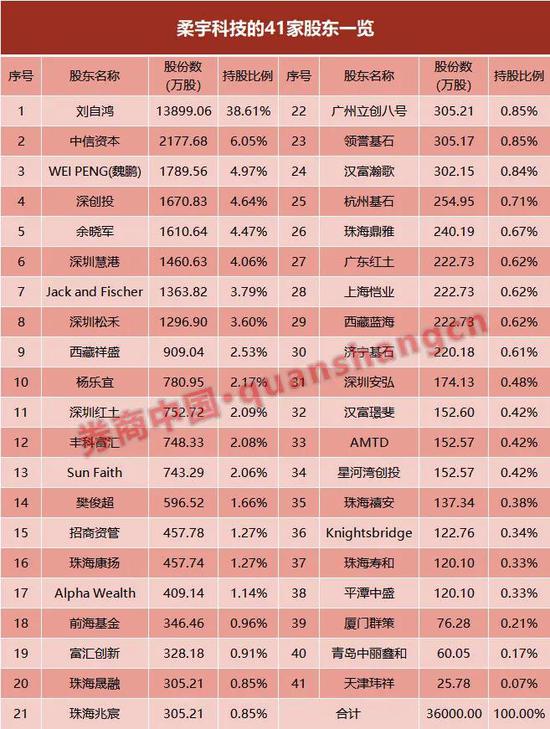 在柔宇科技目前的41家股东中,除去包括高管层在内的5位自然人刘自鸿、魏鹏、樊俊超、余晓军及杨乐宜,共有36家风投机构早早提前入驻,其中就包括深创投、Jack and Fischer、Alpha Wealth等在内的多家国内外知名机构。