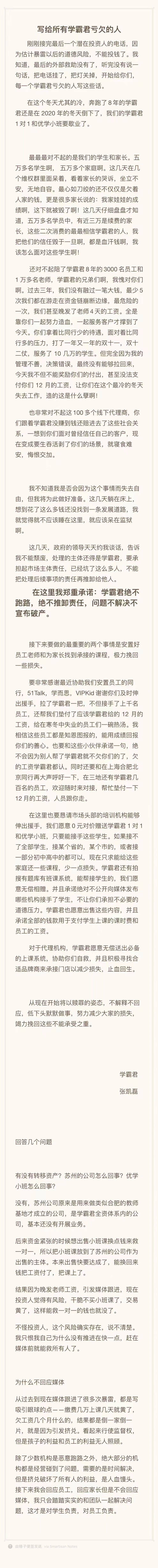 1月2日凌晨,学霸君创始人兼CEO张凯磊在朋友圈发布了一封公开信,就近期学霸君经营困难、员工及学员安置、转移资产等问题进行了回应。