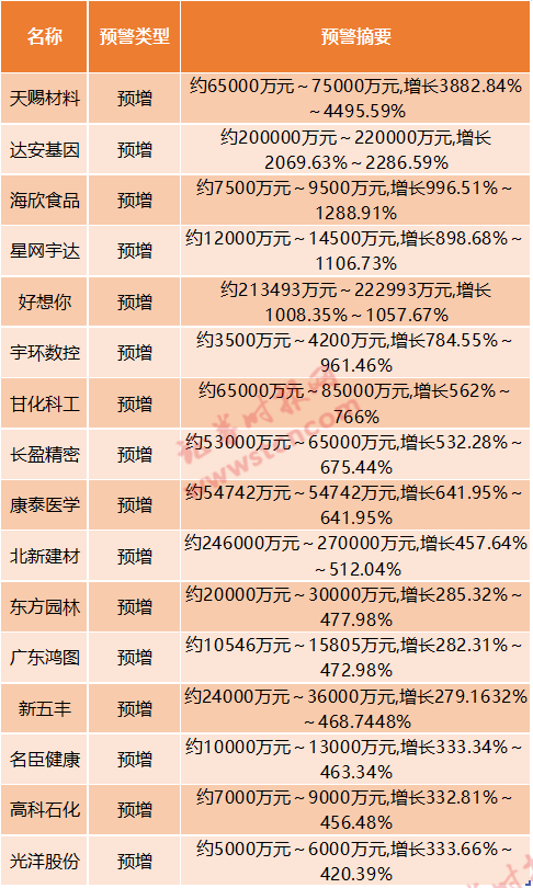 此外,达安基因、海欣食品、星网宇达、好想你等4家公司预期全年净利润最大增幅超过1000%。