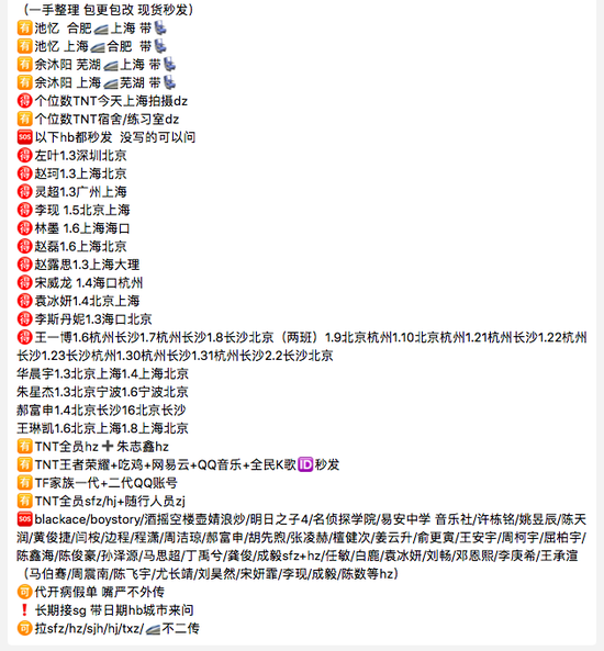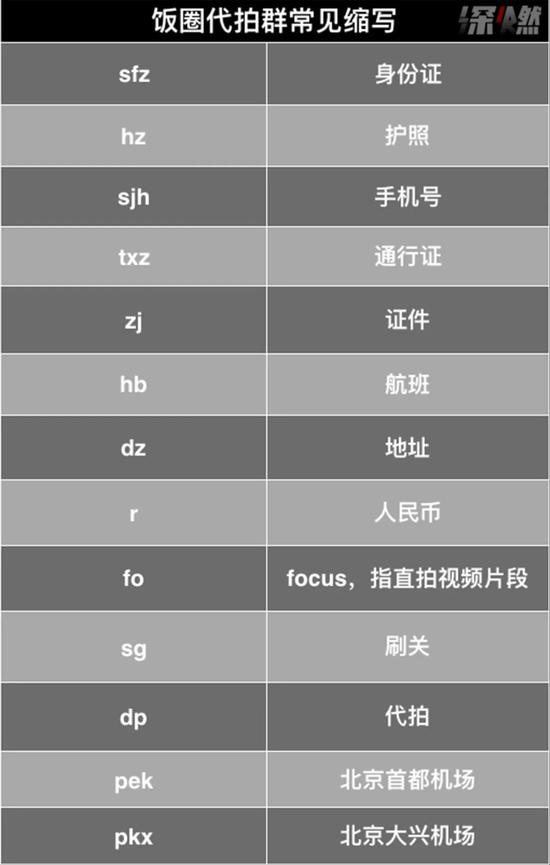 “内娱1000+sfz打包”、“长期接sg”、“拉sfz/hz/sjh/hj/txz/不二传”,在代拍群里,随处可见这样的信息,缩写才是他们的通用语言。而“拉sfz/hz/sjh/hj/txz/不二传”,即是指可查询明星身份证号、护照、手机号、户籍、通行证等,“拉”是带有灰色意味的“查询”。