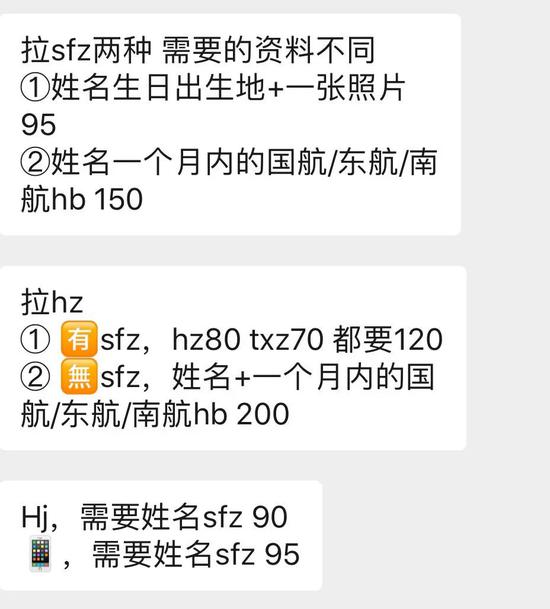 还想获取其他明星身份证号码?这也在这群中介的业务中,不过收费更贵,价格在95-200元之间。在另一名中介发给深燃的业务信息里,拉sfz(身份证)有两种方式,需要的资料不同,第一种需要明星姓名、生日、出生地以及照片,第二种需要姓名,以及一个月内的国航/东航/南航航班信息。
