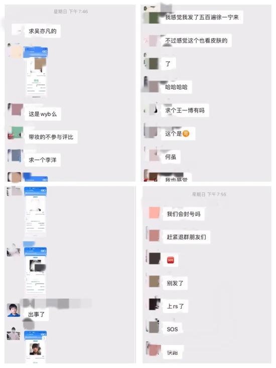 当晚7点53分,群里有人提醒,“上rs(热搜)了”。在一位粉丝一口气连刷了多位明星的健康宝照片后,警惕的人多了起来,“别发了”,“这个群会炸吗?”,“赶紧退群朋友们”。接着有人退群,有人沉默,有人开始狂刷其他信息试图覆盖之前的照片,群主随即将群名从“jkb(健康宝)分享群”改回为“dp(代拍)闲聊群”。