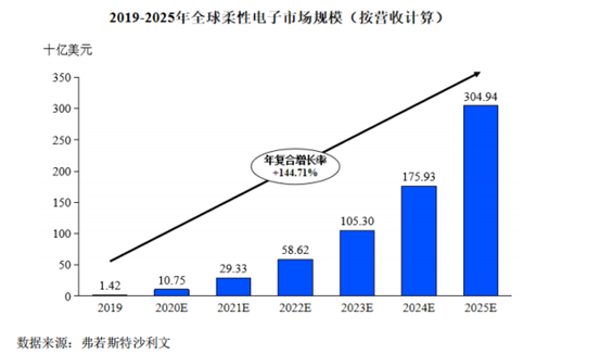 从目前市场情况来看,无论是三星还是京东方,其柔性屏(三星是折叠屏手机)的出货量较传统屏的出货量还不可同日而语,柔宇的营收数字偏低也就不难理解;整体上,目前全柔性显示这一赛道仍然处于早期的市场培育阶段,离进入市场成熟期还有一段距离,其市场潜力远未得到有效释放——不过,机构对这一赛道的未来预期可不低:根据弗若斯特沙利文的报告,预计到2025年全球柔性电子行业的市场规模将达到3049.40亿美元,2019年至2025年的年复合增长率约为144.71%。智能移动终端、智能交通、文娱传媒、智能家居、运动时尚和办公教育等各行各业对柔性电子技术的需求预计将迅速增长。