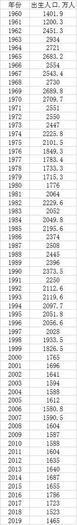 第一财经记者根据国家统计局历年数据,对近六十年出生人口统计梳理发现,近30年(即1990~2019年)比上一个30年少出生1.42亿人口,按照推算,两年后退休洪峰即将到来。