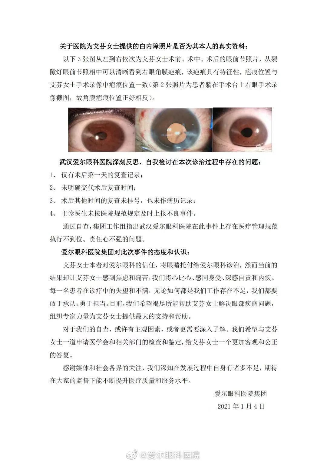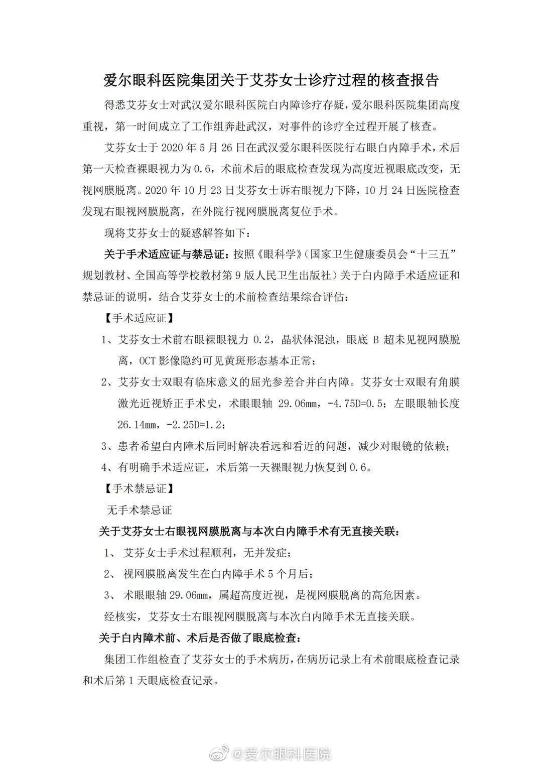 1月4日早间5:54分,爱尔眼科官方微博发布《关于艾芬女士诊疗过程的核查报告》称,艾芬女士右眼视网膜脱离与本次白内障手术无直接关联。同时,武汉爱尔眼科医院也深刻反思,未明确交代术后复查时间,术后其他时间的复查未挂号,也未作病历记录。