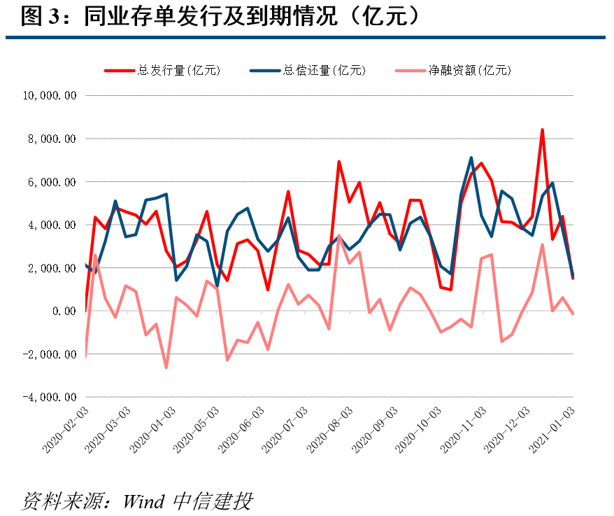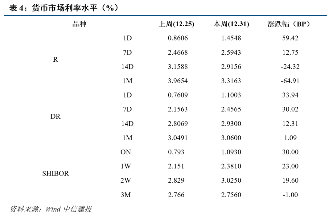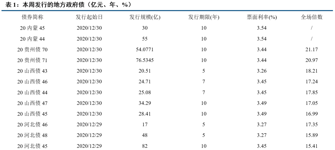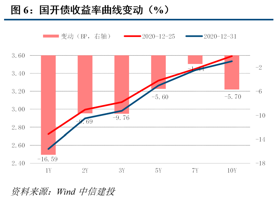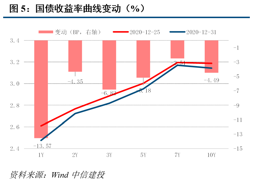 本周(2020年12月28日-2021年1月3日,下同)国债收益曲线整体有所下移。受央行公开市场操作呵护跨年资金面、海外疫情导致风险偏好回落、12月债券供求相对失衡等因素影响,各期限收益率均有下行,中短端表现相较于长端表现更好。具体来说:本周1年期国债收益率下行13.57BP至2.4739%,2年期国债收益率下行4.35BP至2.7226%,3年期国债收益率下行6.82BP至2.8174%,5年期国债收益率下行5.18BP至2.9512%,7年期国债收益率下行2.51BP至3.1699%,10年期国债收益率下行4.49BP至3.1429%,10-1年期限利差继续扩大57.82BP至66.90BP。政策性银行债方面,10年期国开债下行5.70BP至3.5338%,10年期进出口债收益率下行3.22BP至3.6481%,10年期农发债下行1.72BP至3.6540%,政金债长端收益率整体呈现下行态势。本周货币市场利率涨跌互现,由于本周处于年末最后一周,跨年资金压力较大,因此1D期各品种利率出现大幅上行。同时全周来看,7D期以及1M利率均有所上行,1D期涨幅较大,1D期R、DR、SHIBOR利率较上周分别上行59.42BP、33.94BP、30.00BP。