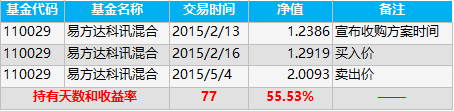 2015年4月16日,东方财富复牌,连续走出了11个涨停板,于5月4日开板。如果投资者5月4日盘中赎回基金,按照易方达科讯当日2.0093的净值计算,所对应的收益率为55.53%。剔除申赎基金相关的费用(2.37%)后,实际收益率为53.16%。东方财富复牌后至5月4日的区间涨幅高达161.46%,意味着为易方达科讯贡献了12.6746%的净值。