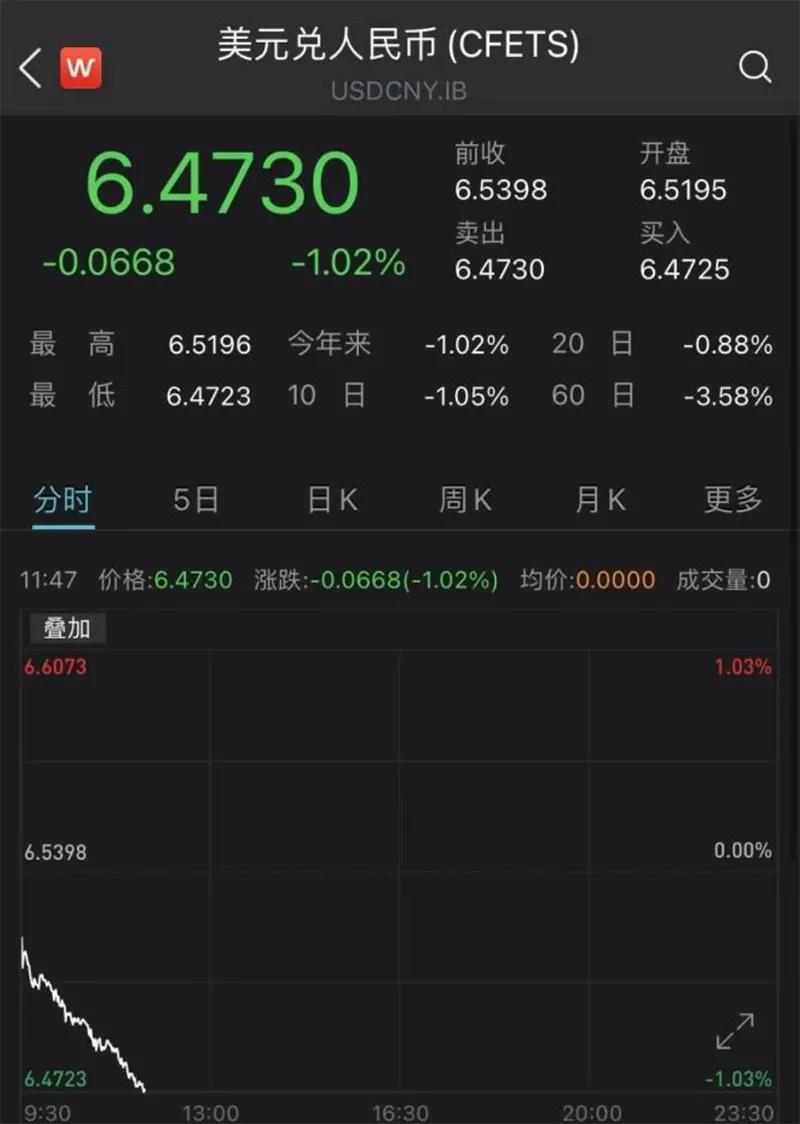 离岸人民币对美元直线走高,最高触及6.4539,日内上涨超过400点。