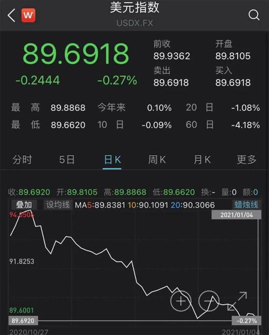 截至发稿时间,美元指数延续弱势,跌0.28%报89.68,已连续第4个交易日处于90关口下方。