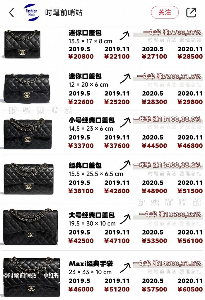 小红书用户对香奈儿近两年涨价幅度进行总结