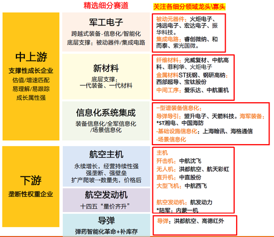 其认为,跨越式武器装备发展子板块的优势趋势已于此前的报告期显现,因而行业目前已进入右侧区域,而非左侧预期阶段。建议在目前阶段关注板块十四五方向对应机遇,即将“五年期思维”作为投资价值理解的重点。可精选两条主线赛道:①中上游支撑性的成长标的(军工电子、军工新材料、信息化);②下游垄断性的权重企业(航空主机、航空发动机、导弹)。