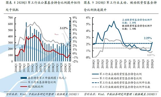 同时,应注意到军工核心资产估值处于十年中枢偏下位置,仍然相对较低。中证军工指数估值目前也处于历史中枢位置,后续仍有提升空间。军工板块基金重仓持股比例已经自2019年三季度以来首次回升,但和2015年高点持仓相比,提升空间仍大。
