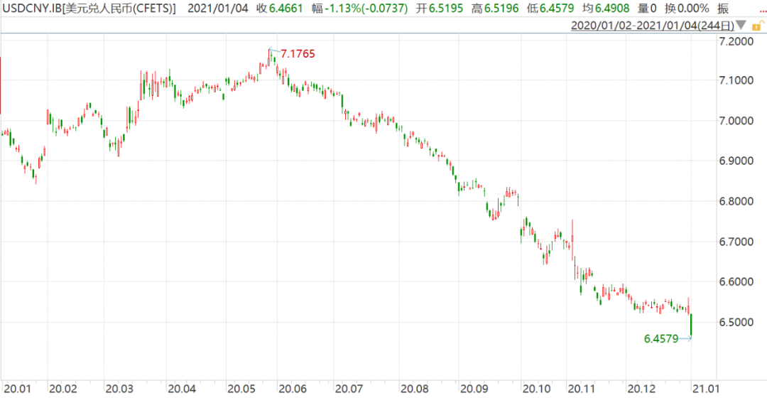 2021年1月4日,在岸人民币对美元汇率跳空高开200点,盘中接连收复6.50、6.49、6.48、6.47、6.46关口,最高涨至6.4579元,创下2018年6月20日以来新高,重返6.4时代。