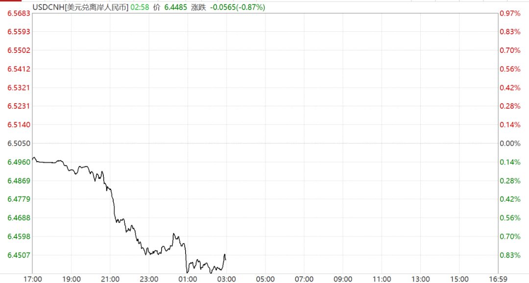 离岸人民币对美元汇率则在盘中率先突破6.45关口,截至15:50,最高涨至6.4417元,较前收盘价涨633点。