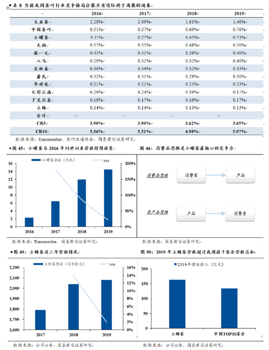 风未至,追风之路昭然若揭。从竞争格局角度来看,当前我国茶行业边际趋于离散化,2019年行业CR10仅为5.1%,较2016年下滑0.3pct,分化加剧背后最核心的原因在于市场参与者受小农经济思维的禁锢,从自身出发设计产品及营销思路,造成产品不标准、品牌影响力微弱、渠道粗放等问题,因此无法俘获消费者“芳心”;而小罐茶和立顿的成功经验已经点明破局之路:贯彻消费品经营思路是核心,产品标准化/便利化+营销/产品简单化是抓手。
