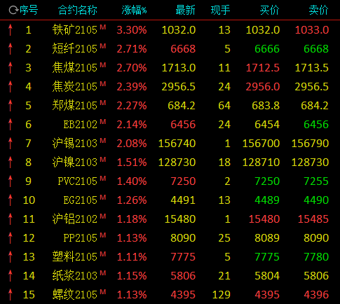 热点栏目1月5日,国内期市开盘,铁矿石涨逾3%,短纤涨近3%,焦煤、焦炭、动力煤涨逾2%;豆二、豆粕、棕榈油跌逾1%。