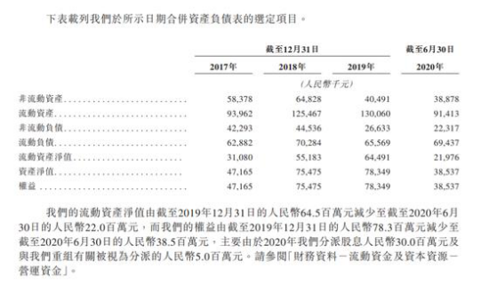 据新浪港股,在公司招股书披露这样一条消息,公司的流动资产净值和股东权益从2019年大幅减少。截至2020年中期,公司流动资产净值从2019年底的6449万元减少到2020年中期的2198万元,公司股东权益从2019年的7835万元减少为2020年中期的3854万元。根据公司招股书,公司权益建撒后主要是因为2020年分派股息3000万和重组分派人民币500万。