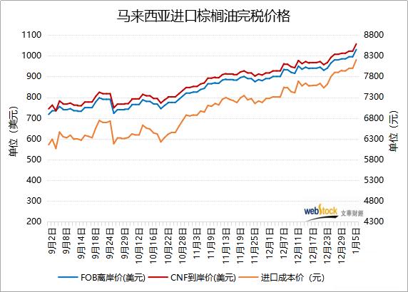 1月5日马来西亚棕榈油离岸价为1030美元,较上日涨35美元,进口到岸价为1057美元,较上日涨35美元,进口成本价为8203.19元,较上日涨206.03元,连续第三日上涨。因市场担忧阿根廷供应中断以及南美的干旱天气状况,竞品豆油价格上涨,马来西亚BMD毛棕榈油期货周一收高,棕榈油进口成本价跟盘大幅上调。棕榈油在2020年录得连续第二年上涨,在不利天气和基础设施问题导致供应趋紧的情况下,棕榈油需求依然强劲。一驻吉隆坡的交易商表示,印尼和马来西亚潜在的洪灾也可能影响棕榈油供应。
