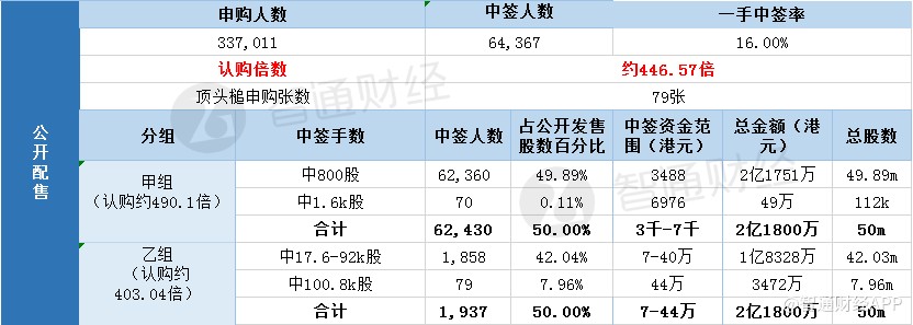 其中,公开配售申购人数337011人,一手中签率16%,认购倍数约446.57倍。