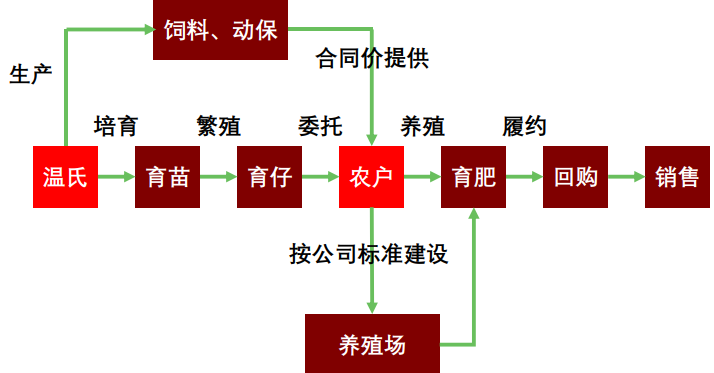 以牧原股份为代表的一体化自育自繁自养模式,企业自建养殖场,统一采购饲料、疫苗,雇佣农工集中进行种猪的育种和扩繁、猪苗的培育、生猪育肥等全部生产过程,并统一销售给终端消费者。从上游的育种和饲料,到中游的扩繁和育肥,再到下游的屠宰销售,牧原通过一体化的产业链,做到生产全环节可控。