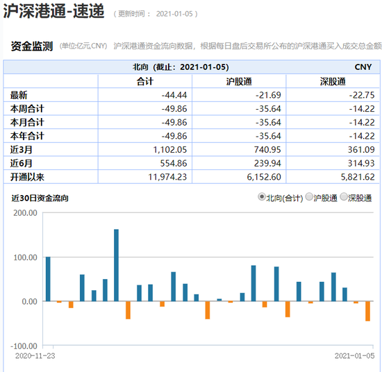 北向资金,今日净卖出44.44亿元。其中,沪市净卖出21.69亿元,深市净卖出22.75亿元。