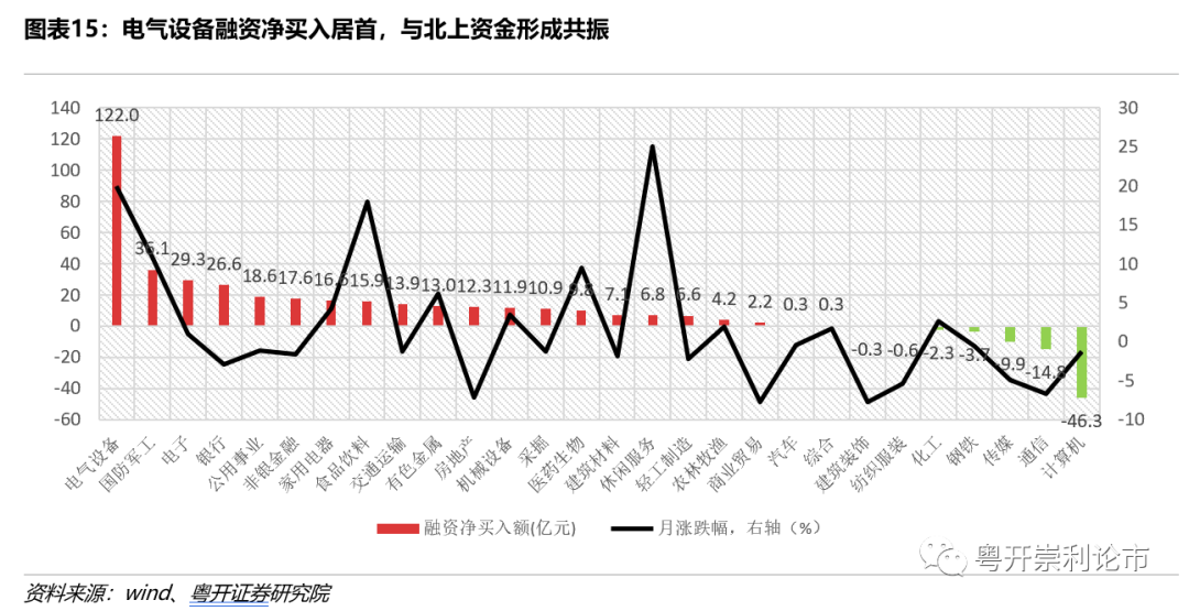 具体到行业来看,当月电气设备、国防军工、电子、银行、公用事业板块融资净买入居前,最大净买入122亿元,融资客大举买入电气设备,与北上资金形成共振;计算机、通信、传媒、钢铁、化工板块融资净卖出居前,最大净卖出46亿元。
