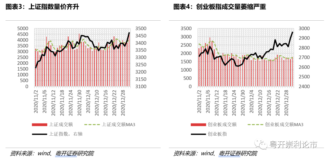 为了剔除交易日的扰动,我们选取日均成交额来类比(以下均同)。从日均成交额来看,上证日均成交3631.23亿元,环比增加5.09%;深证日均成交4512.80亿元,环比减少7.43%;创业板日均成交1716.03亿元,环比减少18.24%。上证指数量价齐升,创业板指成交量萎缩严重,与指数上行并不匹配。12月中旬开始,创业板权重较大的电气设备、医药生物大涨带动指数上行,但是数据显示增量资金尚未跟随进场。