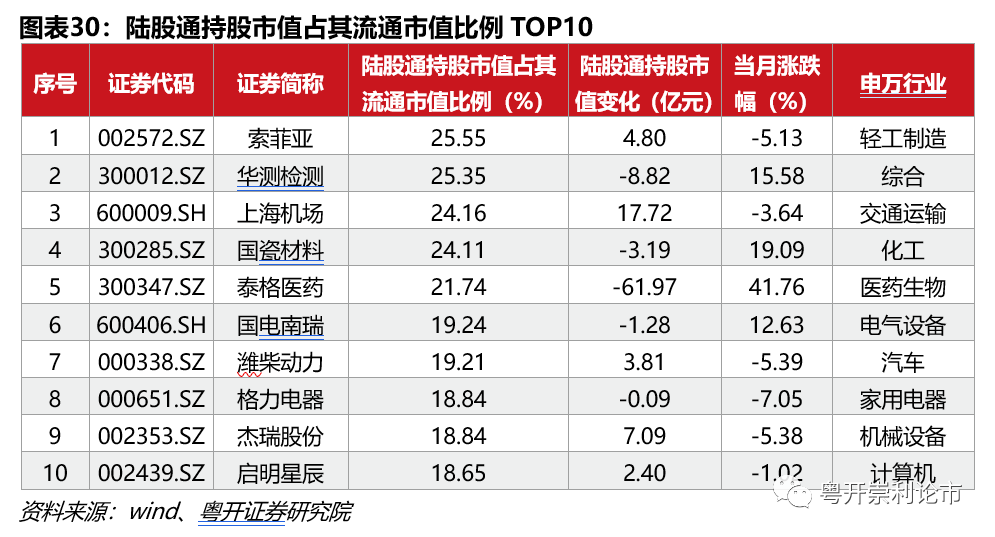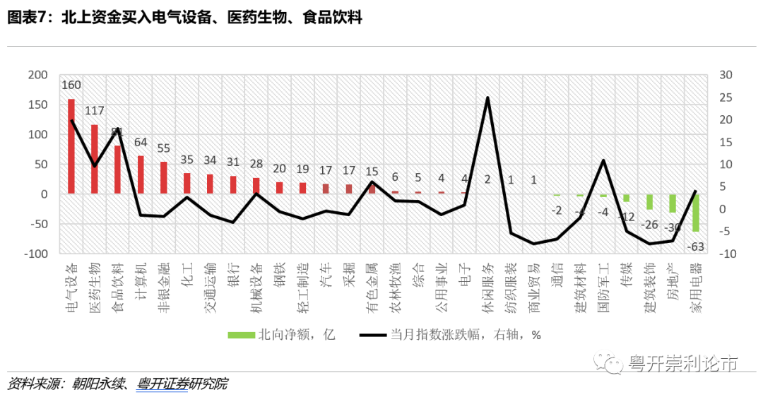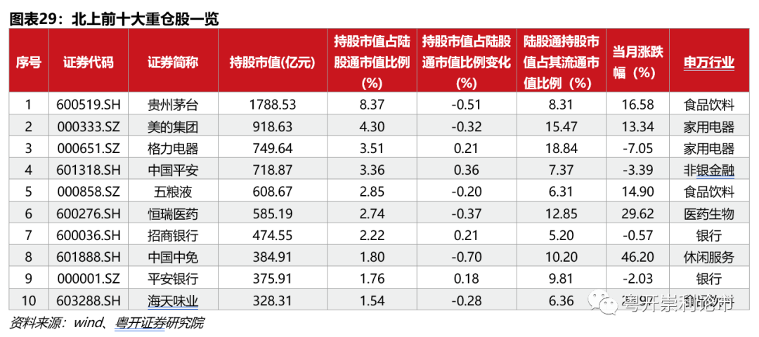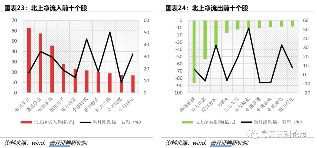 整体来看,当月北上资金净买入572亿元,其中,沪股通净买入381亿元,深股通净买入191亿元,连续2个月呈现沪强深弱的格局。当月北上资金日均交易总额为857.26亿元,占全部A股成交额的比重为10.53%,较此前有所回落。