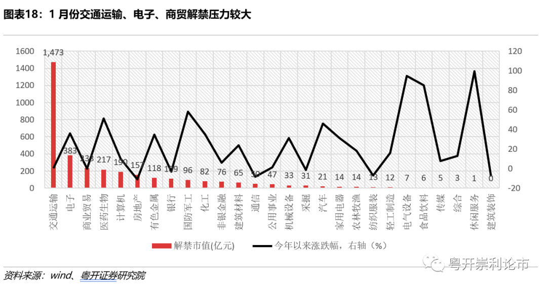 1月份,A股市场共有119家公司涉及解禁,解禁规模为3454亿元,压力略有缓解。从行业分布来看,交通运输、电子、商业贸易、医药生物、计算机板块解禁压力最大,解禁市值分别为1473亿元、383亿元、233亿元、217亿元、190亿元。1月交通运输行业解禁压力最大,主要是由于该板块中京沪高铁解禁市值高达1358亿元。