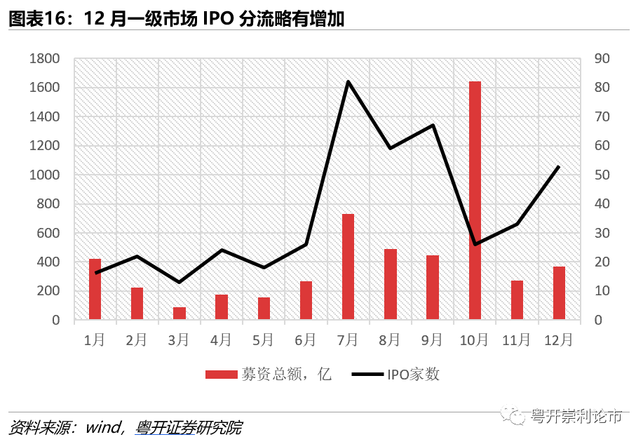 12月份,按网上发行日期统计,A股市场共有53家公司IPO上市,具体分板块来看,主板/中小板/三板/科创板/创业板上市家数分别为8家/11家/7家/15家/12家。募资总额上升至369亿元,前一个月为270亿元,环比略有上升,分流压力略增。