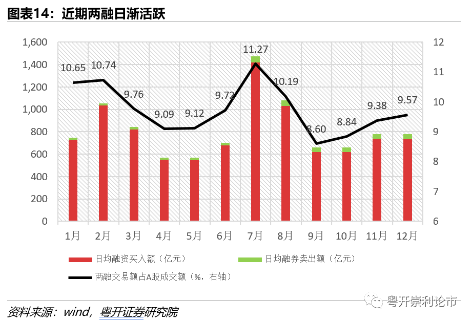 12月份,沪深两市日均融资买入额为734.35亿元,环比下降0.74%;日均融券卖出额为44.12亿元,环比上升10.27%;两融交易额占A股成交额的比重为9.57%,环比上升2.03%,近2个月融资买入额较此前上了一个台阶,但相较于前期日均超千亿的水平仍处于较为合理的区间。