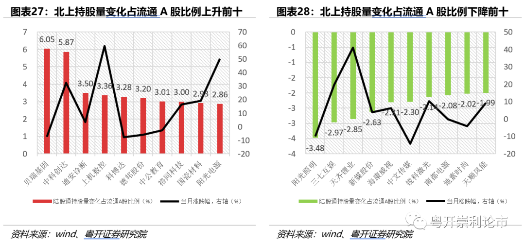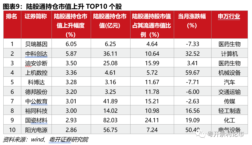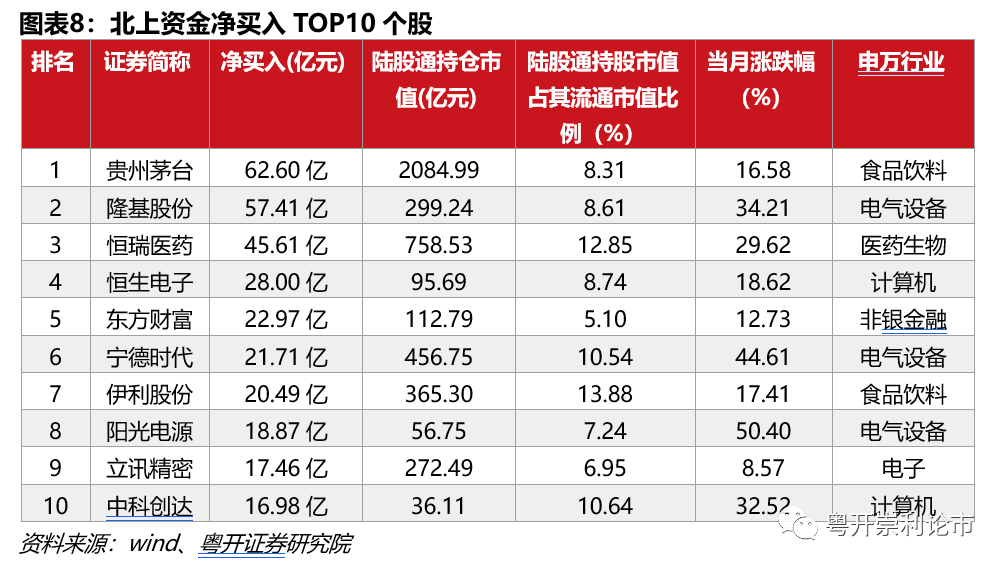 具体到个股来看,12月贵州茅台、隆基股份、恒瑞医药、恒生电子、东方财富为净流入前五个股,最大净买入63亿;贝瑞基因、中科创达、迪安诊断、上机数控、科博达为陆股通持股增量占流通A股比例上升幅度居前个股,最大上升6.1%。