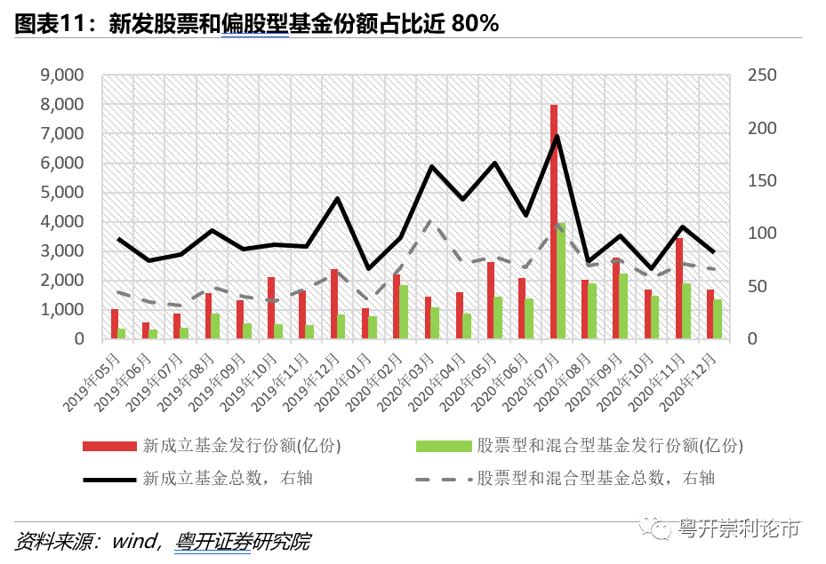 从新成立基金情况来看,在今年7月达到高点,随着市场热度下降,新成立基金的份额和数量也逐渐降温,但股票型和偏股型基金发行热度不减,12月新发股票和偏股型基金份额占比近80%,基金市场火爆。