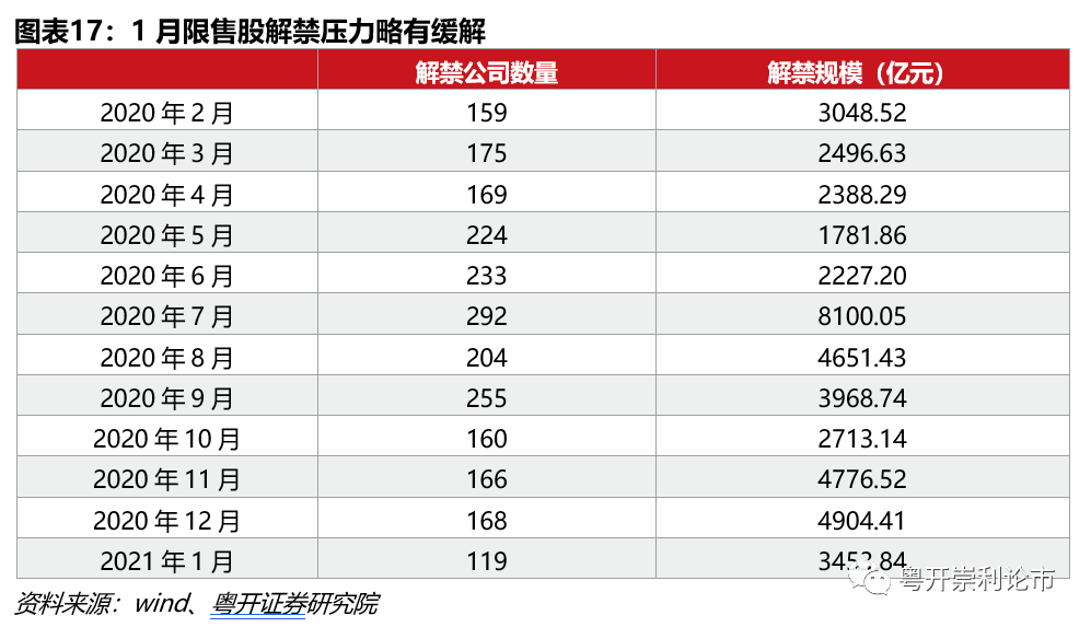 1月份,A股市场共有119家公司涉及解禁,解禁规模为3454亿元,压力略有缓解。