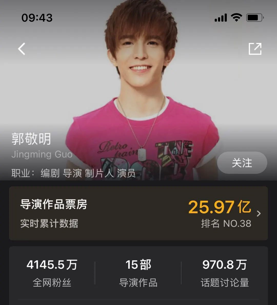 猫眼专业版数据显示,郭敬明已经有15部电影作品,累计票房近26亿元。