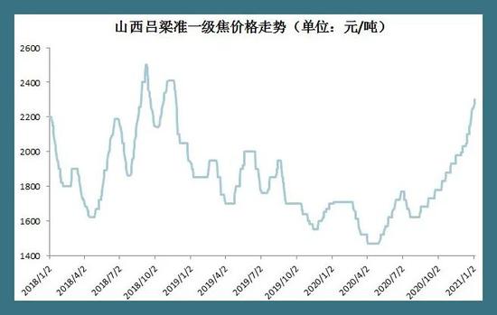 CCI汾渭估价显示,截止1月5日,山西吕梁准一级焦价格报2300元/吨,创两年来新高水平,较去年同期上调600元。河北唐山准一级焦价格报2500元/吨,较去年同期上调540元/吨。山东日照准一级焦价格2800元/吨,较去年同期上调930元。